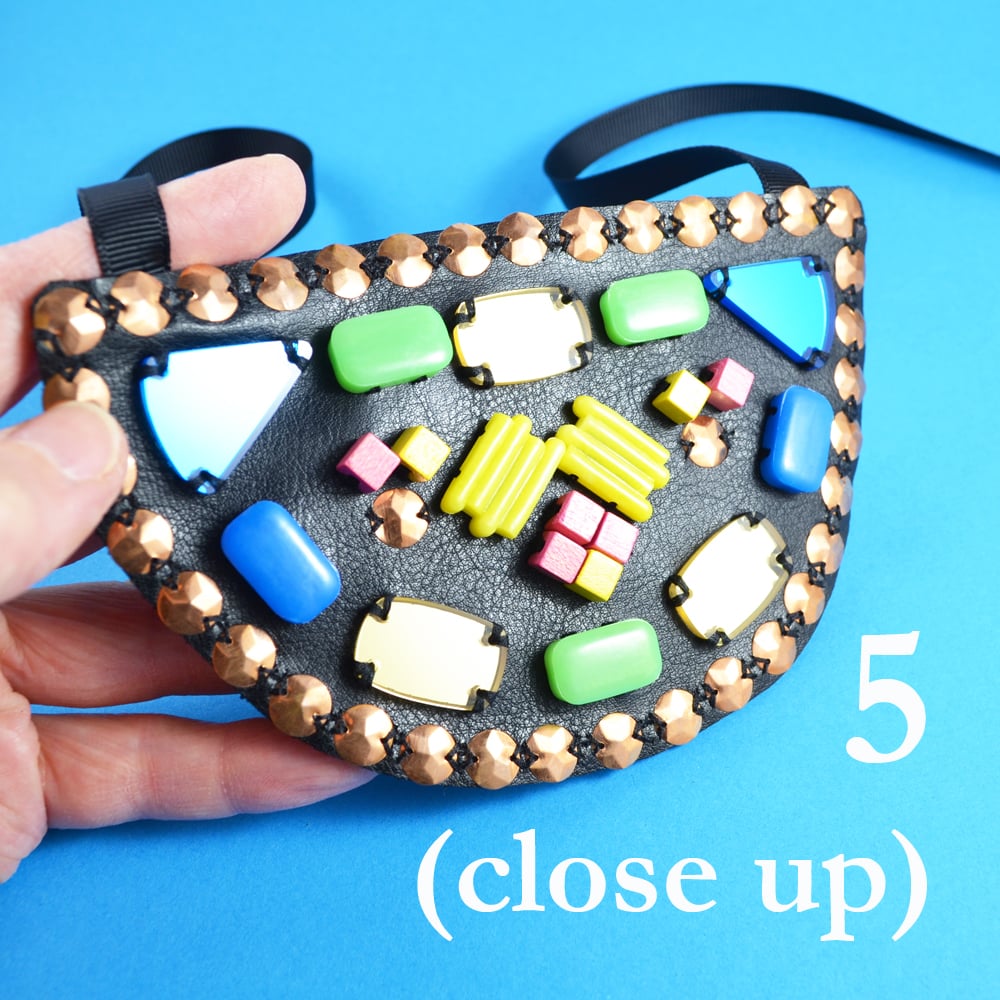 The faux black leather background has been saved since 1999 when Ruth was using it at art school, the sequins are from her great aunt's collection, the plastic beads are from some 80's kids bracelets we bought a few years ago, and the mirrored acrylic jewel shapes are cut out from some off-cuts that another maker gave us about 10 years ago!